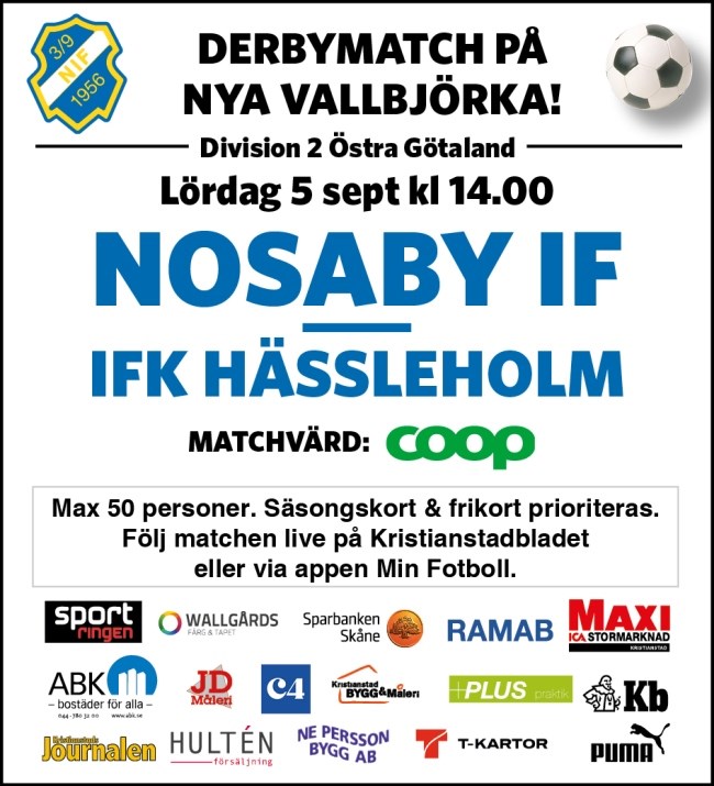 Imorgon är det dags för ett heta derbyt mellan Bromölla och Nosaby på Strandängen. Tyvärr är det fortfarande max 50 personer i publik som gäller. Förslag ligger om höja till 500 fr o m 1 oktober men ännu har ingen info kommit. Matchen kan Du som prenumerant följa på Kristianstadbladets hemsida via denna länk . Avspark kl 14.00. A-Lag 18 sep 2020