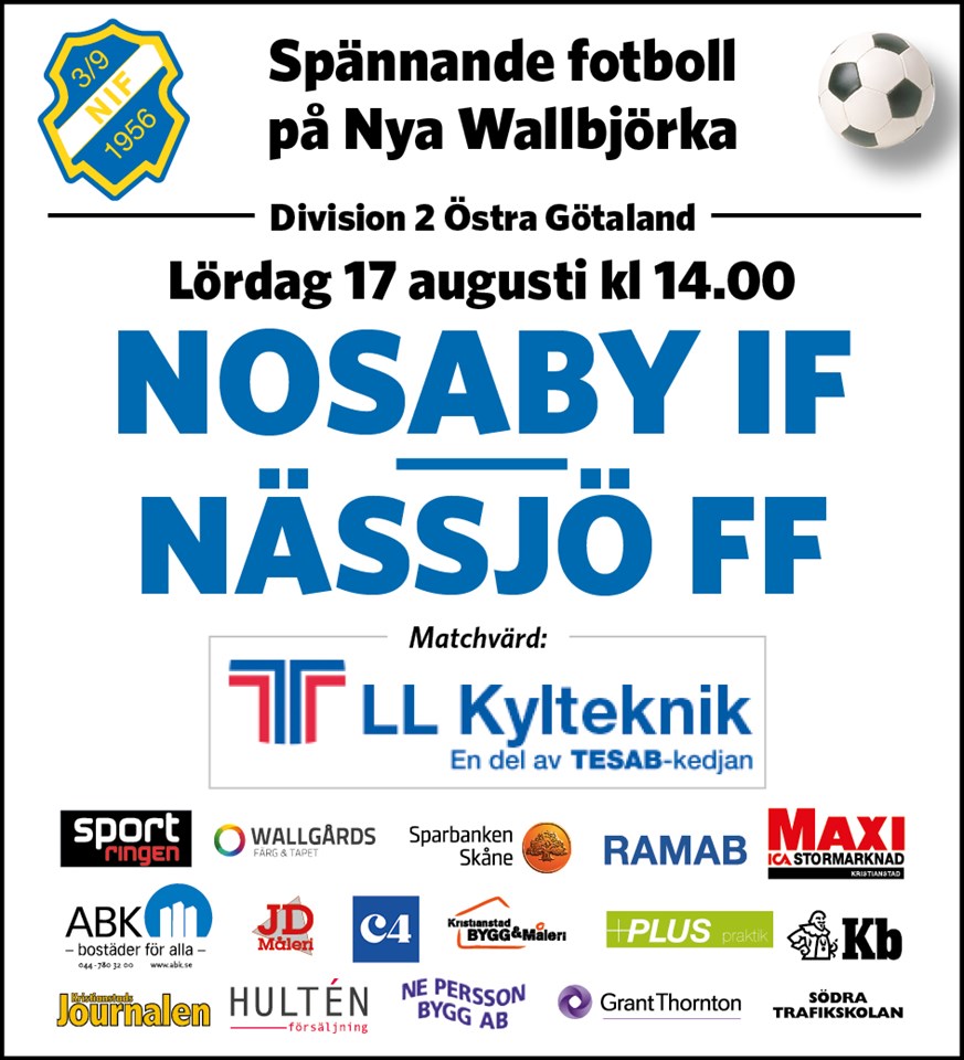 I eftermiddag möter Nosaby tabelljumbon Nässjö på Nya Vallbjörka. Nosaby behöver en vinst för att kunna haka på i kampen om kvalplats uppåt och hålla avståndet nedåt där många lag visar god form. Nässjö har i veckan bytt tränare och under sommaren lånat in 3 spelare från Div 1-laget Värnamo är i stort poängbehov för att klara kontraktet. Nosaby vann vårmötet med 2-1 så det kommer säkert bli en jämn match. Vi hälsar alla välkomna A-Lag 17 aug 2019