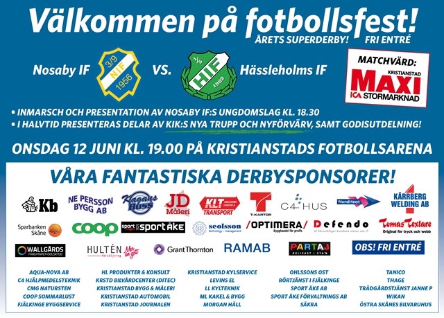 Den 12 juni spelar Nosaby IF en historisk match då vårt A-lag för första gången spelar på Kristianstad Fotbollsarenas A-plan. Nosaby möter Hässleholms IF i ett hett derby med avspark kl 19.00. Vi hoppas att Nosabys fina formkurva håller i sig som fört laget upp till en 5:e plats i tabellen bara 4 poäng från kvalplats uppåt och att laget följer upp Bromöllavinsten med ännu en derbyseger. Tack vare våra Derbysponsorer kan vi bjuda alla på fri entré. För våra sponsorer kommer vi ha en aktivitet i Restaurang Clubhouse där tidigare förbundskaptenen Tommy Söderberg deltar. Innan matchen kommer Nosaby IF:s stora ungdomsverksamhet presenteras genom ett intåg innan avspark ca kl 18.30 på innerplan så vi hoppas Du i god tid och ger dem ditt stöd. I halvtid kommer Kristianstad IK presentera delar av sin allsvenska trupp och nyförvärv. I halvtid är det också Godisutdelning till alla barn. Mer om kvällen hittar Du här i Bladets artikel A-Lag 9 jun 2019