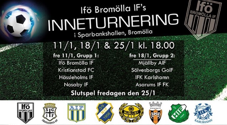 Inomhusturneringarna avlöser varandra. Knappt har Nosaby hunnit smälta finalförlusten i Alliansen förrän det väntar nya matcher. På fredag är det dags för gruppspelet Ifö Bromöllas inbjudningsturnering i Sparbankshallen. Nosaby har ljusa minnen från fjolåret då Nosaby vann turneringen på ett imponerande sätt. 8 av de bästa lagen i området är med i turneringen som är uppdelade i två 4-lagsgrupper. I år har man delat upp grupperna i en Skånegrupp och en Blekingegrupp. Skånegruppen med Nosaby, KFC, Hässleholms IF o Ifö Bromölla spelar 11 jan medan Blekingegruppen med Mjällby, Sölvesborg, Asarum och IFK Karlshamn spelar den 18 jan. Alla lagen från båda grupperna går sedan vidare till Finalspelet fredagen den 25 jan. Placeringen i gruppen avgör Kvartsfinallottningen.Spelformen är 7-manna med 11-mannamål, speltid 2x12 min och underlaget är konstgräs. Nosaby inleder mot Hässleholms IF kl 18.30, kl 19.00 möter man Bromölla och avslutar mot KFC kl 20.30. Hela spelprogrammet hittar Du här A-Lag 6 jan 2019