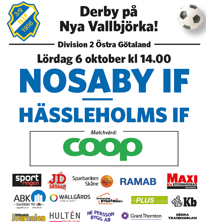 Nosaby tog en poäng i derbyt mot Hässleholms IF när matchen på Nya Vallbjörka slutade 1-1 efter 0-0 i paus. Nosaby hade bara äran att spela för medan HIF hade allt för att kunna hålla Sölvesborg bakom sig i striden om den negativa kvalplatsen. Första halvlek var chansfattig, närmast var bortalaget när Stoffe gjorde en bra räddning på en volley efter en hörna. Nosaby hade mycket boll men skapade inte många chanser. Det syntes klart att varningsavstängde Andreas Grahm saknades i anfallet. 0-0 i halvtid var logiskt. I andra halvlek var det Hässleholm som hade mest boll men var uddlösa. Nosabyförsvaret hade bra koll på Joel Wedenell som gjorde hat-trick i vårmatchen. Nosaby sjönk lite långt tillbaka i planen och gav HIF lite för stora ytor. Anton Henrysson gav HIF ledningen i 78:e min när han fick avancera ostört och sköt ett skott otagbart från 20 meter till 0-1. Målet fungerade som en väckarklocka för Nosaby som kvitterade bara 2 min senare när Rasmus Olsson mycket snyggt nickade in Max Sandbergs precisa inlägg efter en kort hörna. Sista 15 min satsade HIF allt framåt för att återta ledningen och Joel Wedenell var nära men Stoffe räddade på nytt och matchen slutade 1-1. Ett rättvist resultat i ett ganska avslaget derby även om HIF hade ett par klara chanser. Nosaby hade svårt sista tredjedelen när rörelsen var för dålig och passningarna inte satt. För Nosabys del väntar ett nytt derby borta mot IFK Hässleholm på Österås redan nu på torsdag 11 oktober kl 19.00. IFK har efter en stark höst också säkrat kontraktet och slog Bromölla senast med 1-0 så det kommer bli en tuff match. A-Lag 6 okt 2018