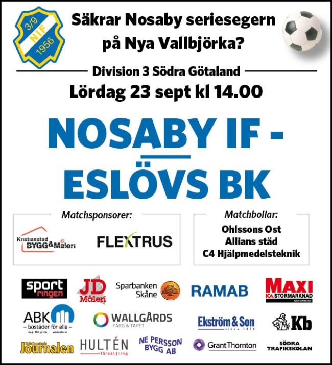 Nosaby säkrade seriesegern i dagens hemmamatch mot Eslövs BK när man vann med 2-0 efter 0-0 i halvtid. Det var en oväntad matchhjälte i form av Jesper Ericsson som svarade för båda målen. Hans mål innebar första seriesegern för klubben på 18 år senast det begav sig var 1999 när Nosaby vann Div 5. Nosaby inledde matchen något nervöst och det var Eslöv som tog kommandot i inledningen av matchen. Nosabyspelarna var helt klart tyngda av matchens betydelse och Eslöv är ett bra lag som överraskat som nykomling. Offensivt saknade Nosaby Julian Grozdanovski och Andreas Dahlbom p g a avstängningar. Kalle Rydhög som har skadeproblem var med i truppen och började på bänken men Peter behövde inte chansa med honom. Robin Lindskog började som ensam anfallare i ett 4-5-1-system. Nosaby kom allt mer in i matchen och lyfte upp spelet. Robin hade ett par lägen att sätta matchens första mål när han kom fri med målvakten men bollen ville inte in. Jesper Ericsson hade en bra nick på hörna som Eslövskeepern precis lyckades tippa till hörna. Eslöv var inte ofarliga utan hade ett par riktigt bra målchanser men 0-0 stod sig till paus. I andra var Nosaby klart det bättre laget. Peter gjorde en taktisk förändring när han flyttade ut Robin på sin vanliga plats på vänsterkanten. Det gav resultat i 66:e min när han kom runt och spelade bollen snett inåt bakåt. En Eslövsförsvarare bröt men inte bättre än att han frispelade Jesper Ericsson som enkelt kunde rulla in bollen i öppet mål. Jesper stod offside men i och med bollen kom från en motspelare upphävdes denna. Mycket bra uppmärksammat av domarteamet. Matchen avgjordes definitivt 8 minuter senare när Daniel Kardum slår ett perfekt inlägg på bortre stolpen där Jesper Ericsson dyker upp och mycket behärskat nickar in bollen. Eslöv försöker sista 20 min nå en reducering men Nosaby är mycket stabila bakåt. Mittbacksparet Henrik Fribrock/Hampus Rydh är seriens klart bästa. Nosaby har några chanser att öka på till 3-0 på omställningar men 2-0 står sig och seriesegern är i hamn. Efter matchen blev det både Champagne och Guldhattar. Nosaby vinner serien rättvist och är seriens bästa lag och nu väntar en guldfest på Kulltorpet. Vi gratulerar ledare och spelare till seriesegern Segern innebär också att laget slipper en nervös sista omgång mot Hörby borta. Vi hoppas att den förlustfria sviten ( 13 matcher) förblir intakt. Hörby kommer ha allt att spela för då laget är indraget i striden om kvalplats nedåt. Avspark 30 sept kl 14.00. A-Lag 23 sep 2017
