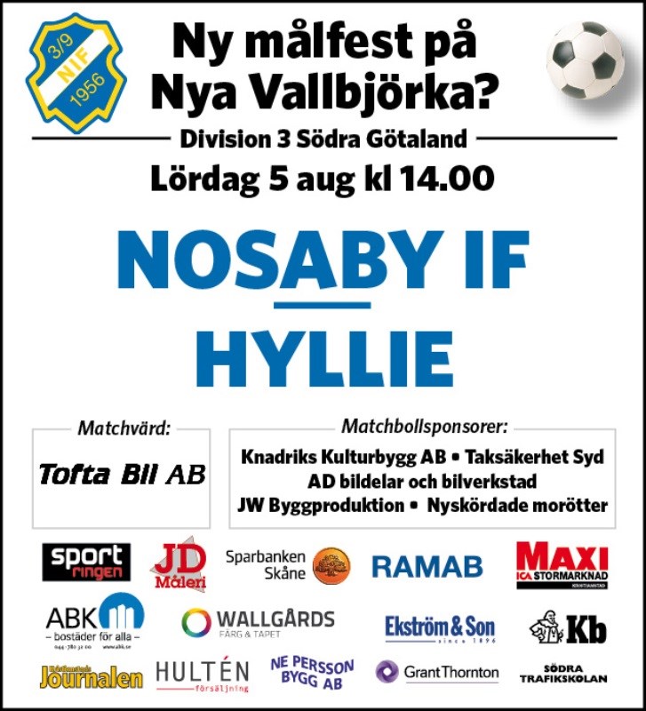 A-laget ångar på och tog en ny storseger idag mot tabelljumbon Hyllie med 7-1 efter 3-0 i paus. Nosaby vann utan att förta sig. Matchinledningen var jämn men Nosaby tog ledningen i 10:e min genom Kalle Rydhög efter en hörna. Efter målet sjönk spelkvalitén och Nosaby gick ner i tempo men Hyllie hade svårt att skapa några riktiga målchanser utan det var mest långskott. I 28:e min fick Nosaby frispark i högerinnerläge som Daniel Kardum tog hand om och via målvakten gick bollen in till 2-0. 3-0 kom 3 min senare genom Boris Bozic som nickade in en hörna. Nosaby skapade chanser till ytterligare mål innan halvtid men 3-0 stod sig till paus och matchen kändes avgjord. Nosaby inledde starkt i andra och Kalle Rydhög gjorde sitt andra mål för dagen fint framspelad av Andreas Dahlbom. I 63:e min fick Hyllie ett tröstmål ur snäv vinkel i misstänkte offsideläge. Sista 20 min tröttnade Hyllie betänkligt och Nosaby kunde göra 3 mål. 5-1 var mycket snyggt. Kalle Rydhög löpte sig fri och osjälviskt spelade in bollen till Robin Lindskog som kunde rulla in bollen i öppet mål. Kalle Rydhög fullbordade sitt Hattrick när han i 81:a min gjorde 6-1. Robin Lindskog avslutade målskyttet i 90:e min när han distinkt sköt in slutresultatet 7-1. Det innebär att Nosaby har imponerande 19-2 i målskillnad på de senaste 3 hemmamatcherna. Nu väntar betydligt tuffare motstånd i form av serieledande BK Olympic på bortaplan. I skrivande stund skiljer 4 poäng upp till förstaplatsen på lika många matcher. Olympic möter Kulladal i ett hett Malmöderby imorgon. Vi hoppas Kulladal tar poäng så Nosaby har allt i egna händer. Matchen mot Olympic spelas 12 aug kl 13.00 på Lindängens IP. A-Lag 5 aug 2017