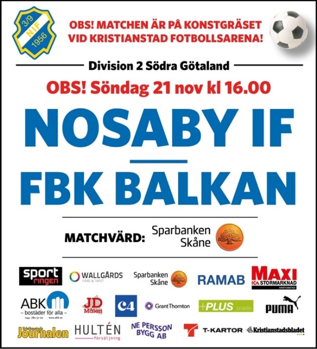 På söndag är det dags för sista "hemmamatchen" som kommer spelas på Konstgräsplan 1 vid Fotbollsarenan. Motståndare är malmölaget FBK Balkan. Avspark kl 16.00. Nosaby behöver en 3-poängare för att fortsätta ha allt i egna händer inför sista omgången av serien. Förlusten senast mot IFK Karlshamn innebar att Nosaby står kvar 29 poäng och är 2 poäng efter Sölvesborg som står över i helgen. 31 poäng har också Asarum som möter serieledande BK Olympic. Nosaby har fördel mot båda lagen genom en klart bättre målskillnad vilket kan bli avgörande om lagen hamnar på samma poäng. Till söndagens match är de 4 nosabyspelare som var avstängda senast tillbaka i truppen så det kommer bli en del förändringar i startelvan. FBK Balkan är nykomlingar i serien som efter en trög start jobbat sig uppåt i tabellen och ligger 6:a i tabellen. Laget är mycket vasst framåt och har seriens skyttekung Sebastian Rask på topp som gjort 20 mål hittills i år. Vi hoppas att det inte fler på söndag. Nosaby har revansch att utkräva efter bortaförlusten med 1-3. A-Lag 19 nov 2021